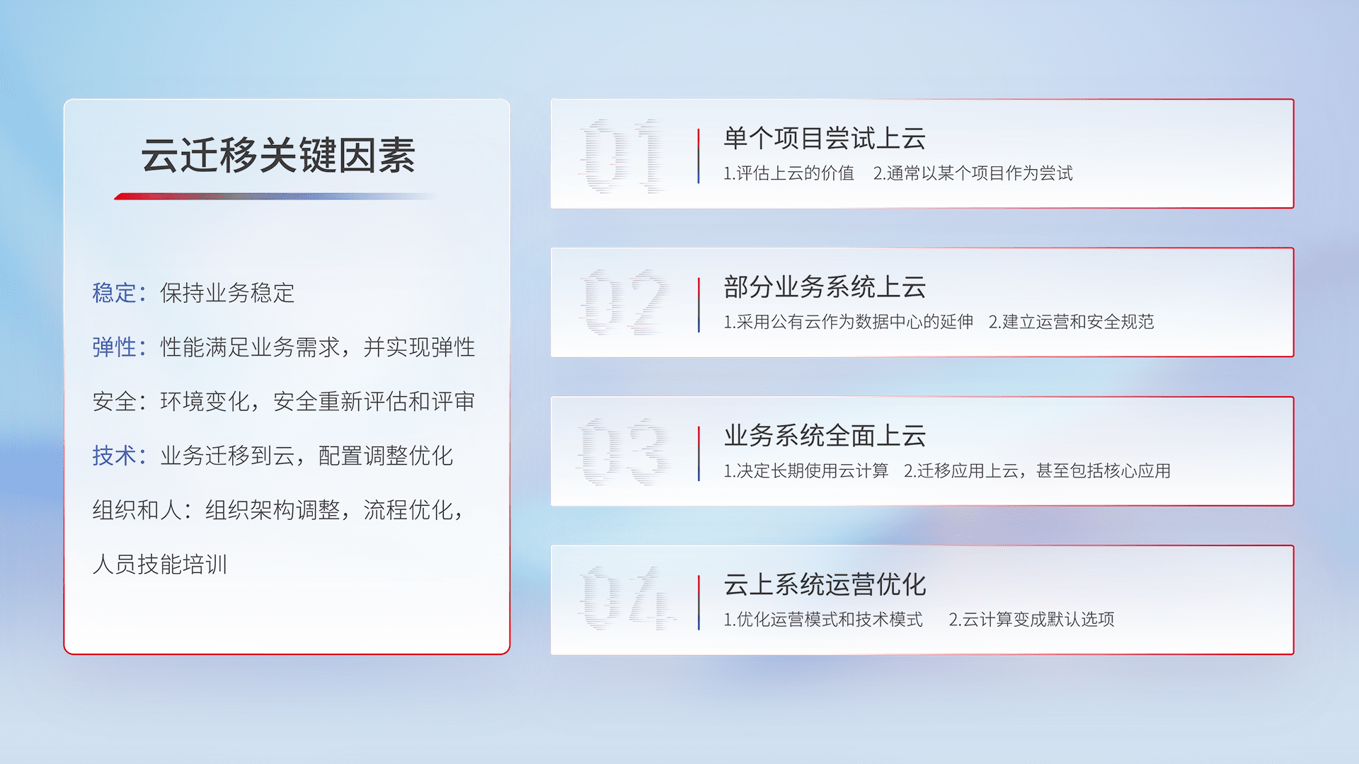 结合实际业务,,从规划设计、、、云平台选型、、、、云原生改造、、、、数据迁移、、、集成交付,,迁移全过程为客户识别最佳上云路径,,,,做好风险识别管理,,设计网络架构、、身份权限、、、安全审计合规、、、、操作审计、、日志审计、、、、监控告警策略、、、、多站点容灾设计等,,,,对云上基础设施进行整体规划,,,,提升IT治理水平,,,,以满足弹性、、、、高可用、、高性能的需求。。。