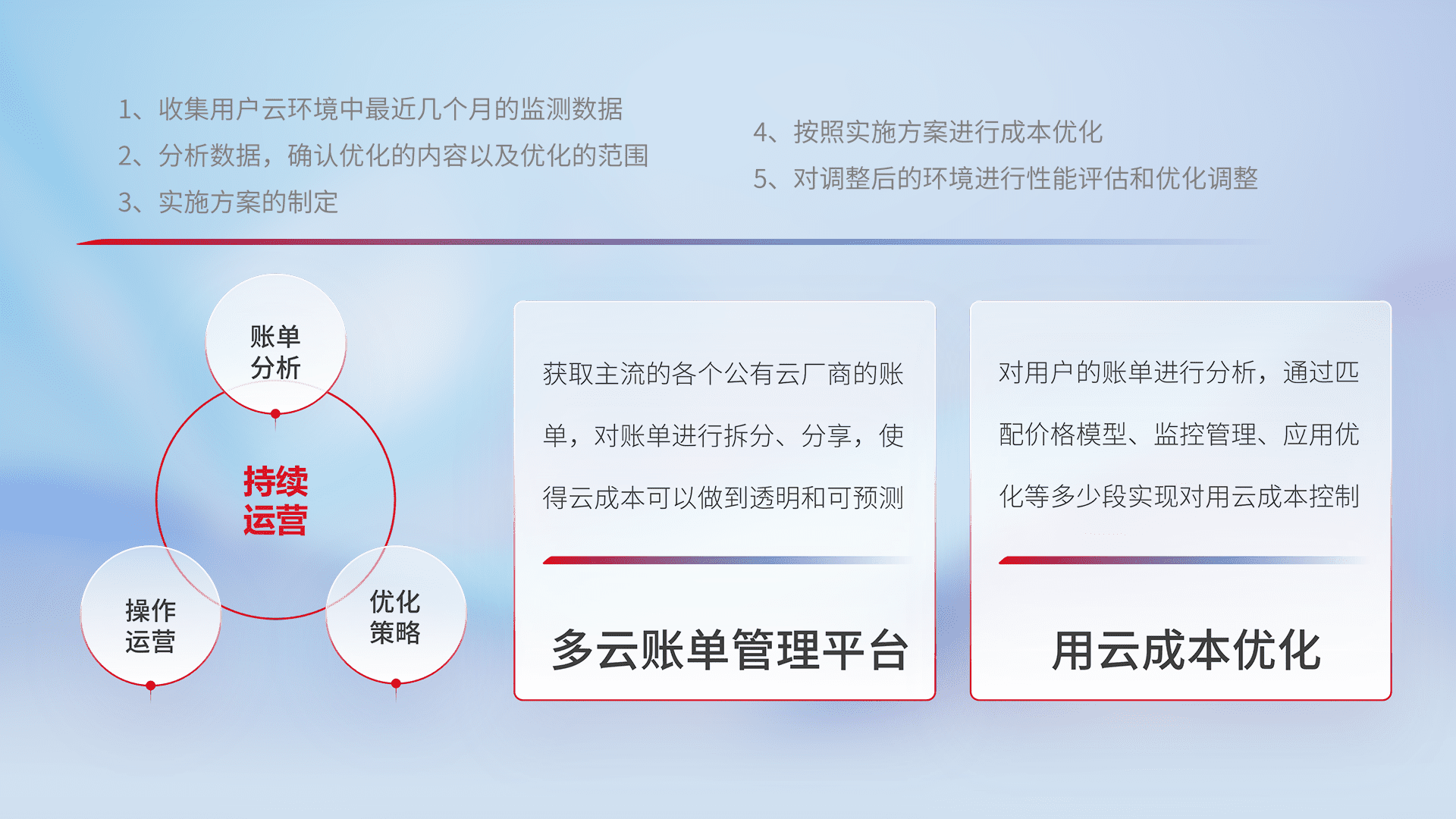 通过多云纳管,,,以统一的资源数据模型把客户的云资源进行抽象和封装,,进而实现对多云资源的统一操作,,,,保障云资源管理的可靠性、、稳定性与可用性。。量身定制化运维内容,,配置、、开发运维、、、、补丁管理、、、、备份、、、监控、、、、认证和访问管理、、、审计和日常巡检等,,,,保障在用云过程中的可靠度,,稳定度以及高可用率。。